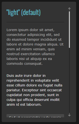 "light" (default) Lorem ipsum dolor sit amet, consectetur adipisicing elit, sed do eiusmod tempor incididunt ut labore et dolore magna aliqua. Ut enim ad minim veniam, quis nostrud exercitation ullamco laboris nisi ut aliquip ex ea commodo consequat. Duis