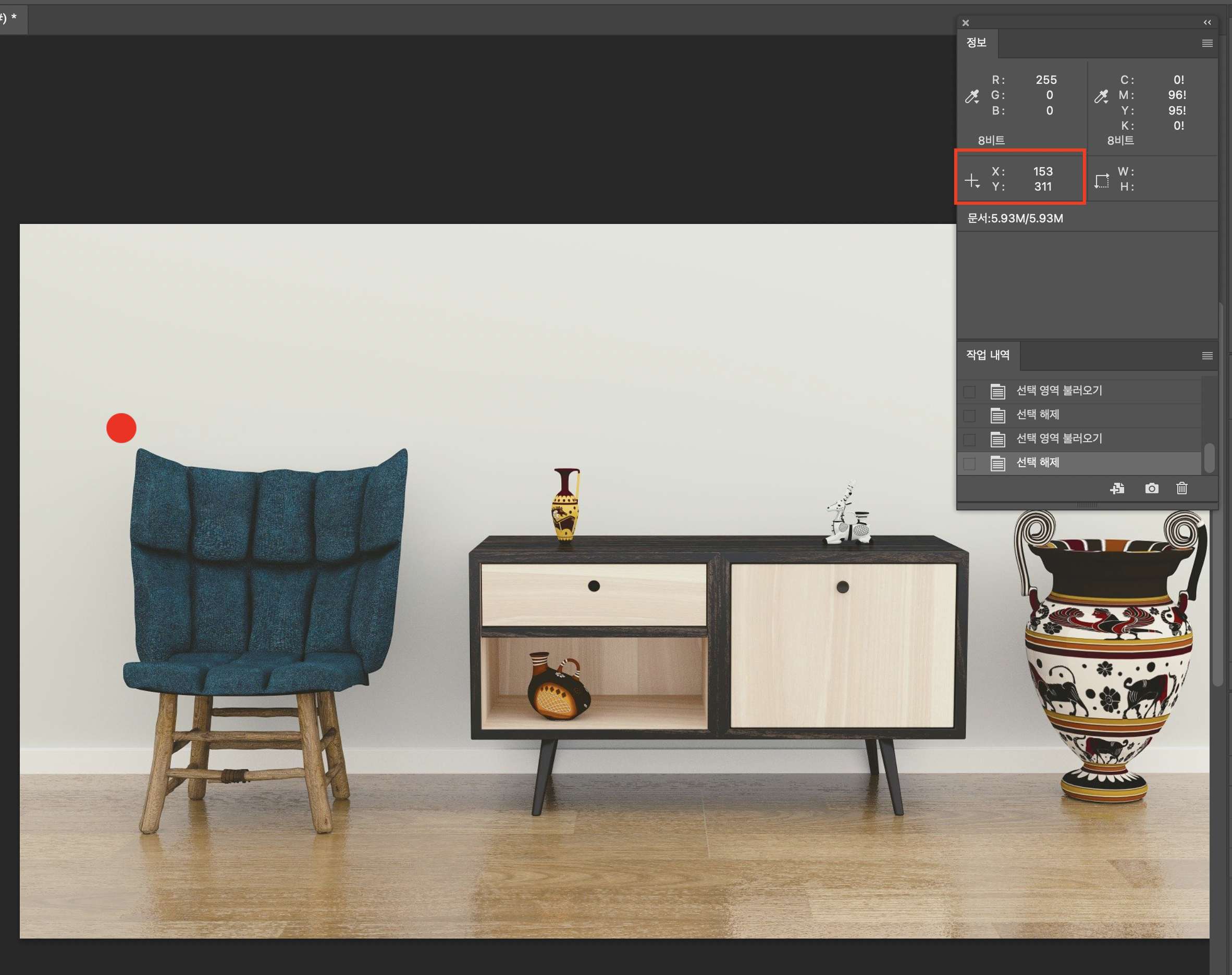 지정하고자 하는 위치에 커서(이미지상 빨간점 위치)를 대면 포토샵의 info에서 x, y값을 확인할 수 있다. (그림판에서도 하단의 정보탭에서 확인할 수 있다.)