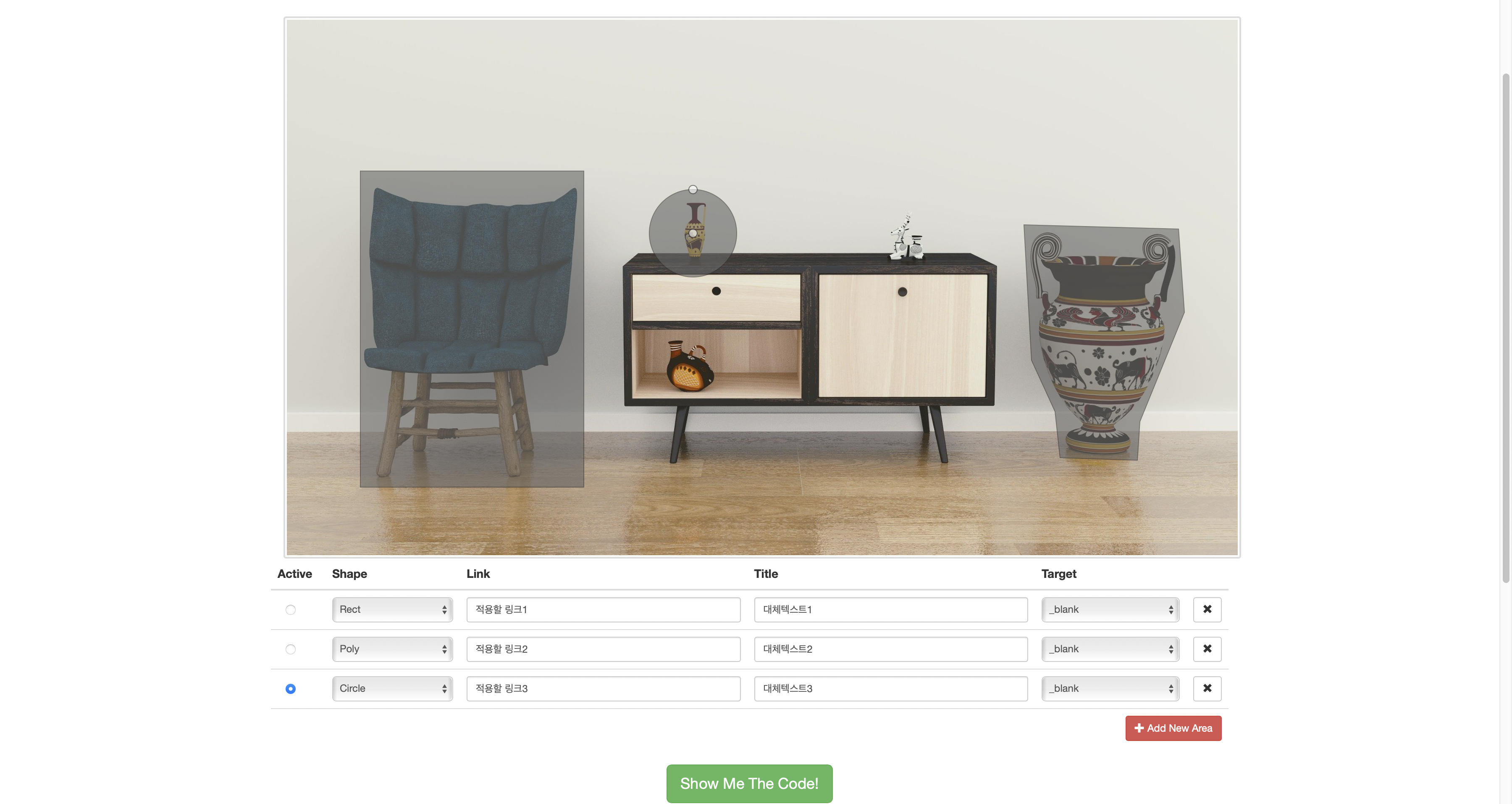 'Add New Area'로 필요한 만큼의 area를 추가 후 좌표 모양을 선택 후 원하는 위치를 찍고 'Show Me The Code!'를 클릭하면
