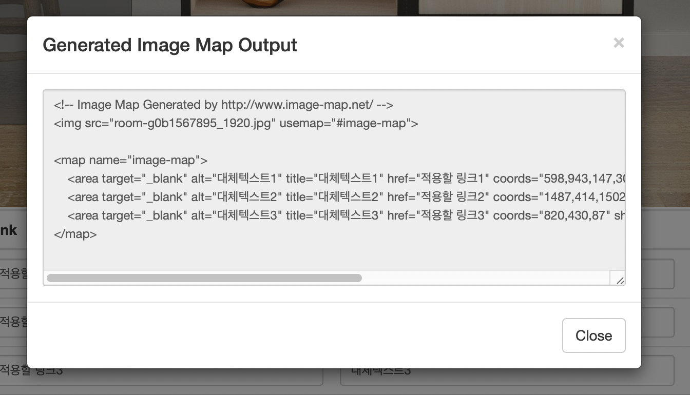 이미지를 업로드 하고 원하는 위치를 찍으면 자동으로 좌표를 입력해주는 사이트들이 있다. 이 사이트를 이용하면 좌표뿐 아니라 정보를 입력해 code로 한 번에 뽑아낼 수 있다.Free Online Image Map Generator