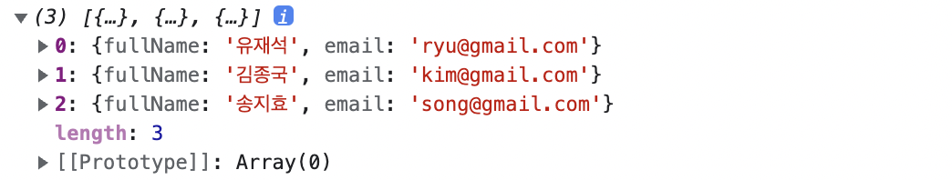 // 유저의 이름의 성과 이름을 합하여 재배열하기 let userList = [ { firstName: "재석", lastName: "유", email: "ryu@gmail.com", }, { firstName: "종국", lastName: "김", email: "kim@gmail.com", }, { firstName: "지효", lastName: "송", email: "song@gmail.com", }, ]; let newUserList = userList.map(function (user) { return { fullName: user.lastName + user.firstName, email: user.email, }; }); console.log(newUserList);