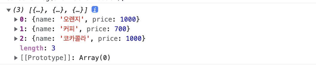 // 예시 : 음료 중 1000원 이하인 음료만 표시하기 let drinkList = [ { name: "오렌지", price: 1000, }, { name: "파워레이드", price: 1400, }, { name: "커피", price: 700, }, { name: "보리음료", price: 1200, }, { name: "코카콜라", price: 1000, }, ]; let availableProduct = []; const inputCoin = 1000; // for문을 사용해서 찾을 경우 for (const drink of drinkList) { if (drink.price <= inputCoin) { availableProduct.push(drink); } } // filter을 사용하면 for문보다 간결하게 찾을 수 있다. availableProduct = drinkList.filter(function (drink) { return drink.price <= inputCoin; }); console.log(availableProduct);