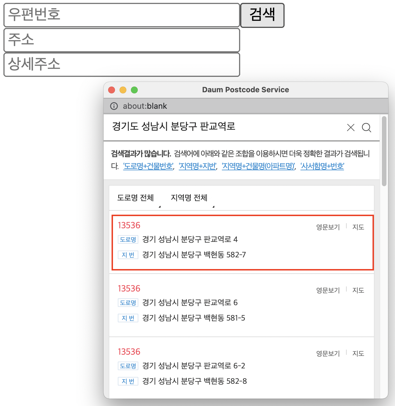 검색 버튼 클릭 후 특정 주소를 선택하면 그 정보 중 우편번호와 주소가 입력장에 전달되는 것을 확인핧 수 있다