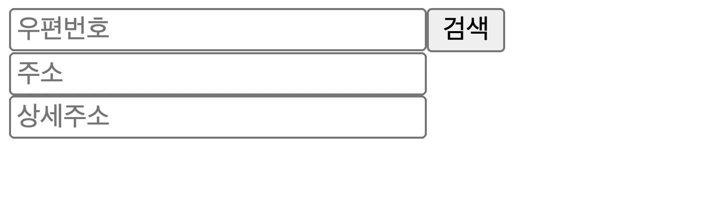 데이터를 받아올 곳은 입력 및 수정할 수 없도록 우편번호, 주소 input에 readonly 추가, 주소 데이터를 전달받을 수 있도록 v-model로 변수 연결, 검색 버튼을 클릭시 주소검색 창이 나오도록 @click이벤트를 삽입하였다.