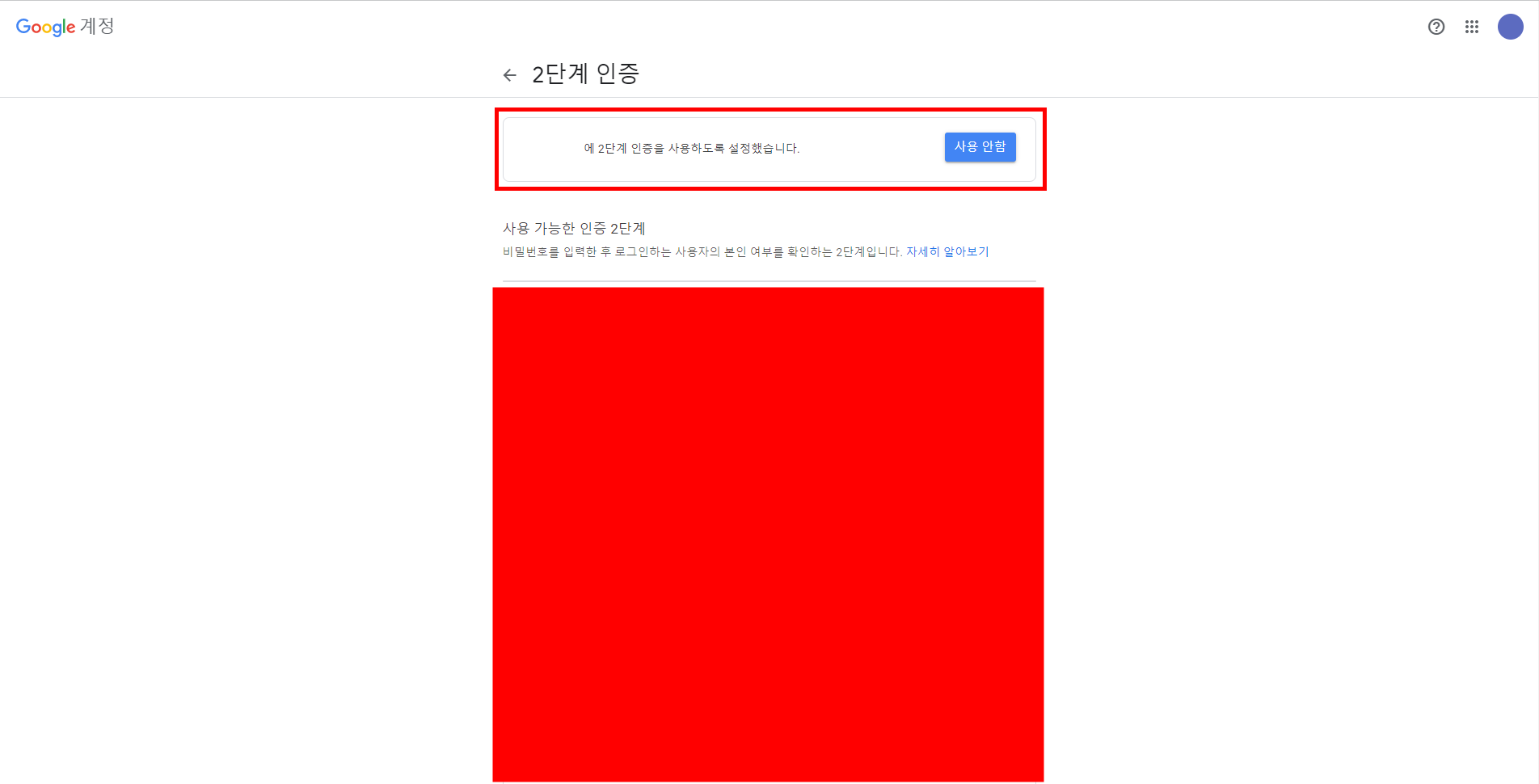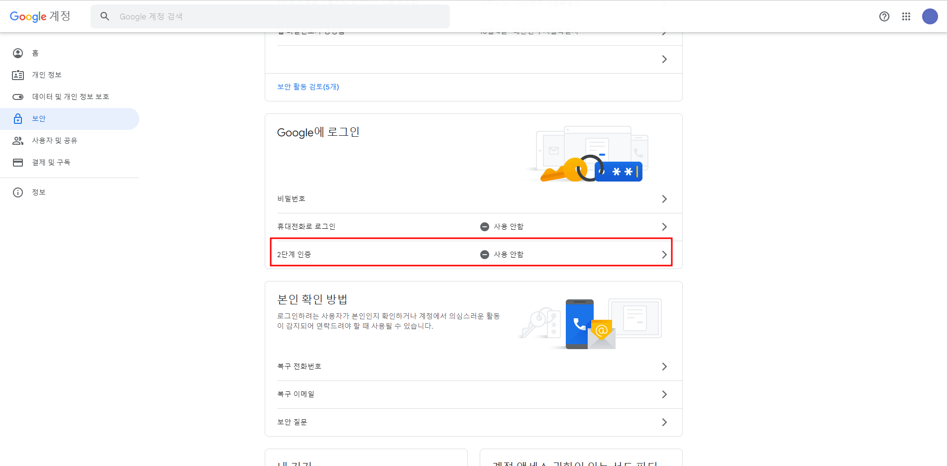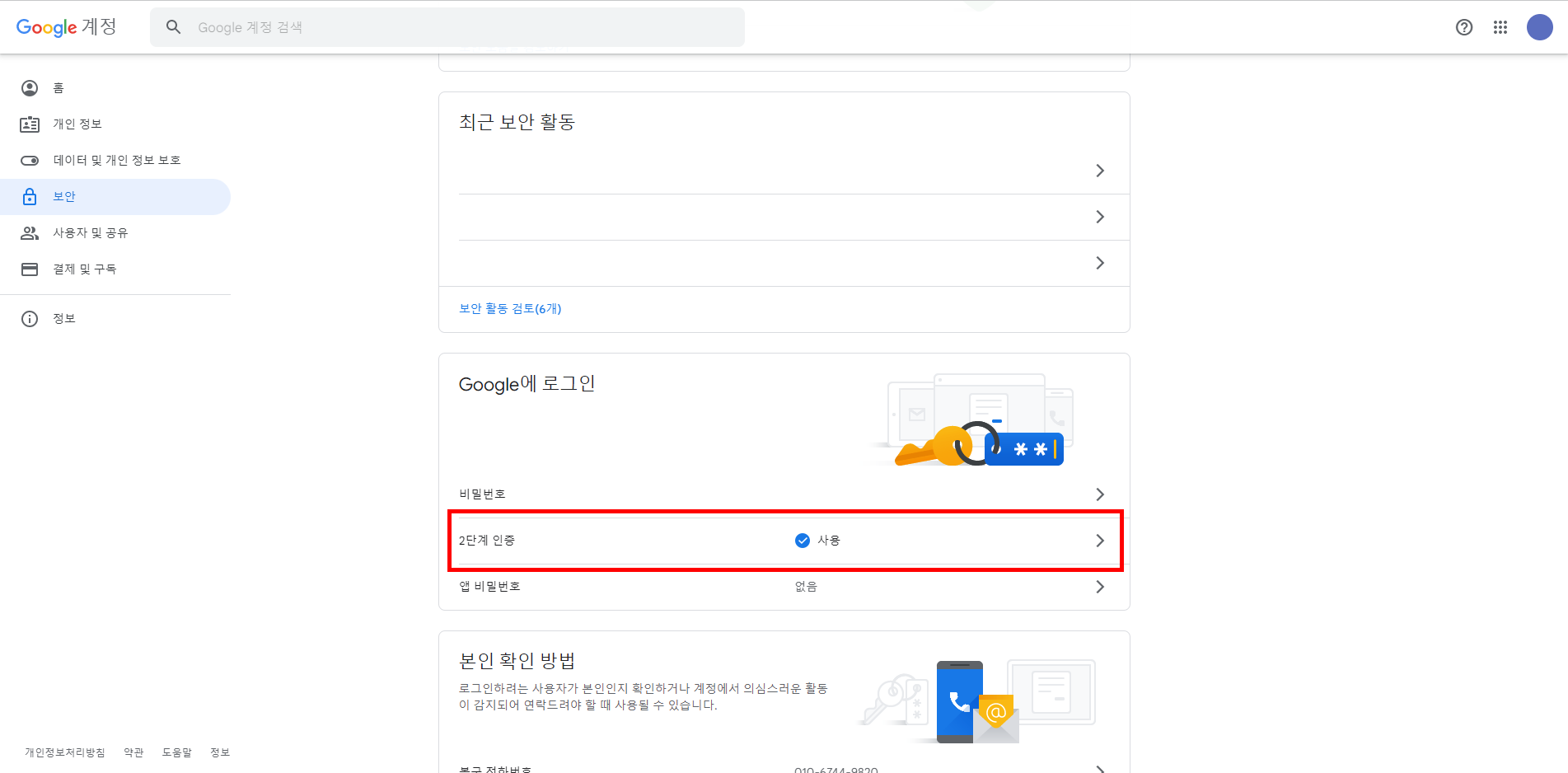 '2단계 인증' 클릭구글계정 비밀번호 입력 후 2단계 인증 기기 인증 화면이 나오는데 화면에 따라 절차를 밟으면 된다. 인증 완료 후 2단계 인증 페이지가 나오고계정 > 보안 페이지로 돌아왔을 때 2단계 인증이 아래와 같이 나왔다면 인증은 정상적으로 완료된 것이다.