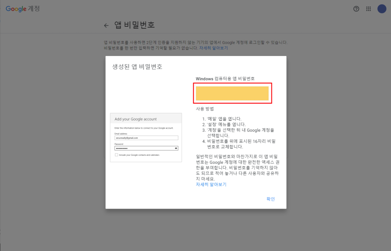 발급받은 앱 비밀번호 복사 : 가렸지만 노란부분에 비밀번호가 표시된다. 복사해서 사용하면 된다.