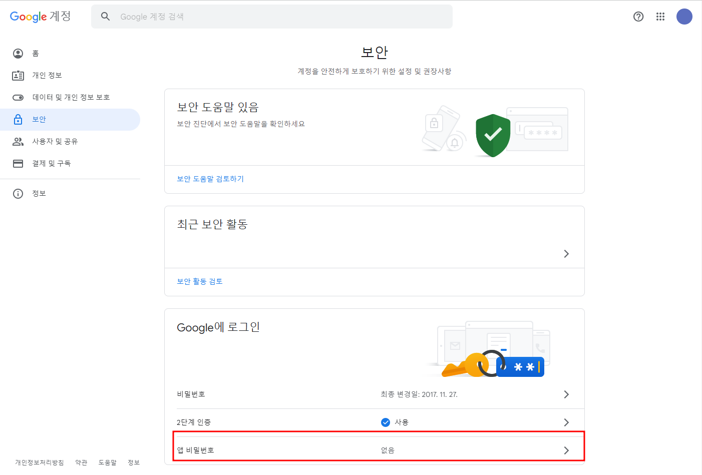 Nodemailer는 2단계 인증을 사용하는 Gmail계정을 등록해 메일을 발송할 수 있도록 지원해준다. 해서 Gmail계정에 접속해 2단계 인증을 사용 설정을 해야한다.