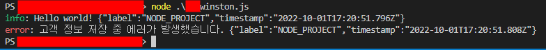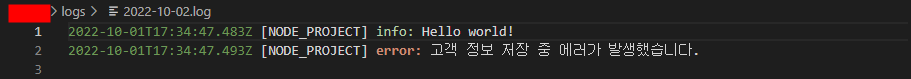 // winston/logger.js에서 export한 logger 가져오기 const logger = require("./winston/logger"); // info와 error 로그 구현 logger.info("Hello world!"); logger.error("고객 정보 저장 중 에러가 발생했습니다.");